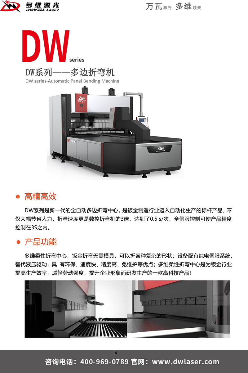 DW係列是新一代全自動多邊折彎中心, 是鈑金製造行業邁入自動化生產的標杆產品,不僅大幅度節省人力,折彎速度更是數控折彎機的3倍,達到了0.5s/次,全伺服控製可使產品精度控製在3S之內。